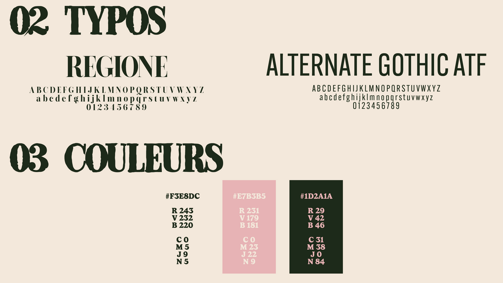 Palette de couleurs + références techniques (RVB, CMJN, HEX)