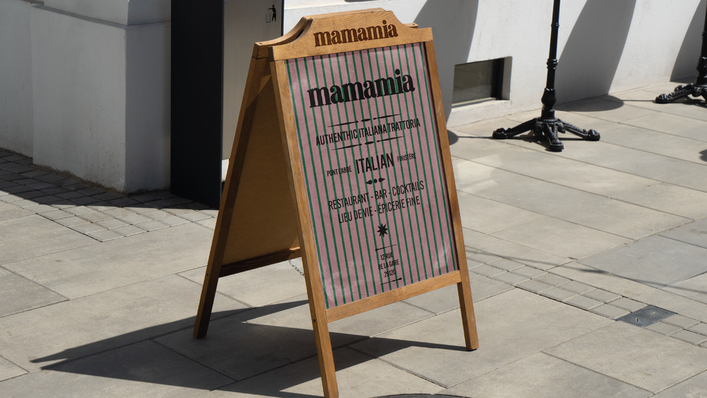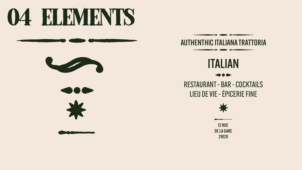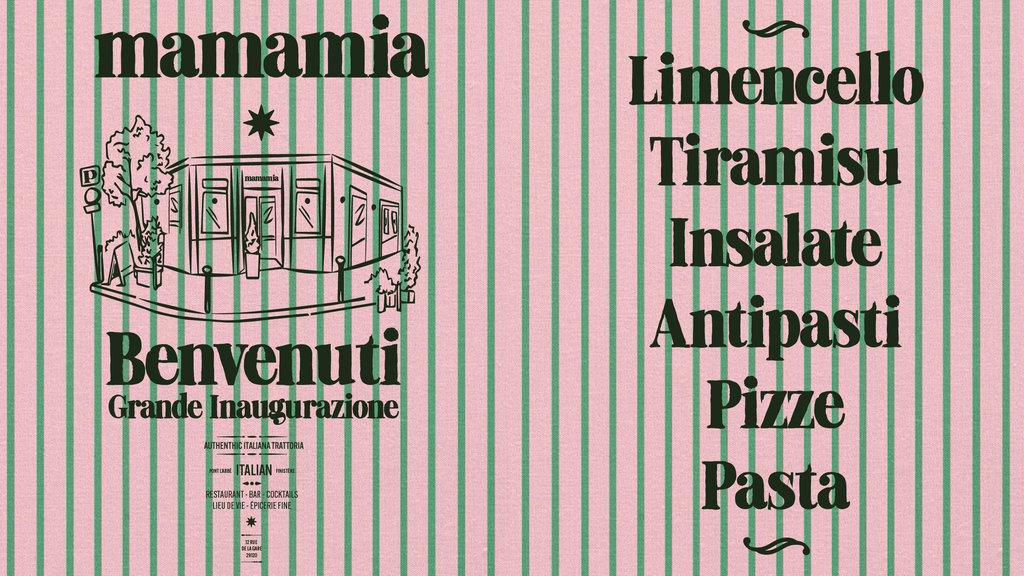 Cette identité graphique a été conçue initialement pour un projet de restaurant italien. Bien que le projet n’ait pas vu le jour, l’identité reste entièrement disponible à la vente et peut être adaptée à votre activité.